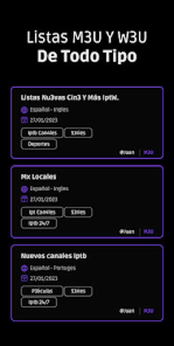 Listas M3u, Android 13.0 veya üstü için mevcuttur. Yazılımın mevcut sürümü 9.8'dir ve sadece İspanyolca olarak çalıştırabilirsiniz.